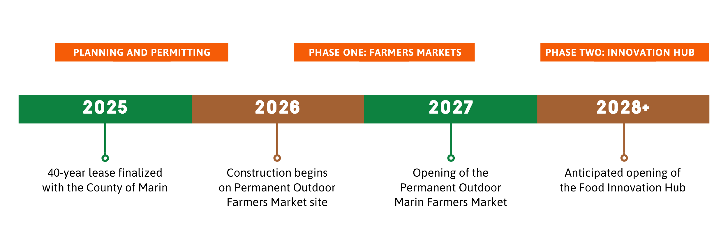 The Lease approved September 16, 2025; construction of Phase One, the permanent Farmers Market, begins in 2026 (opening in mid-2027); Food Innovation Hub is slated to open in 2028.