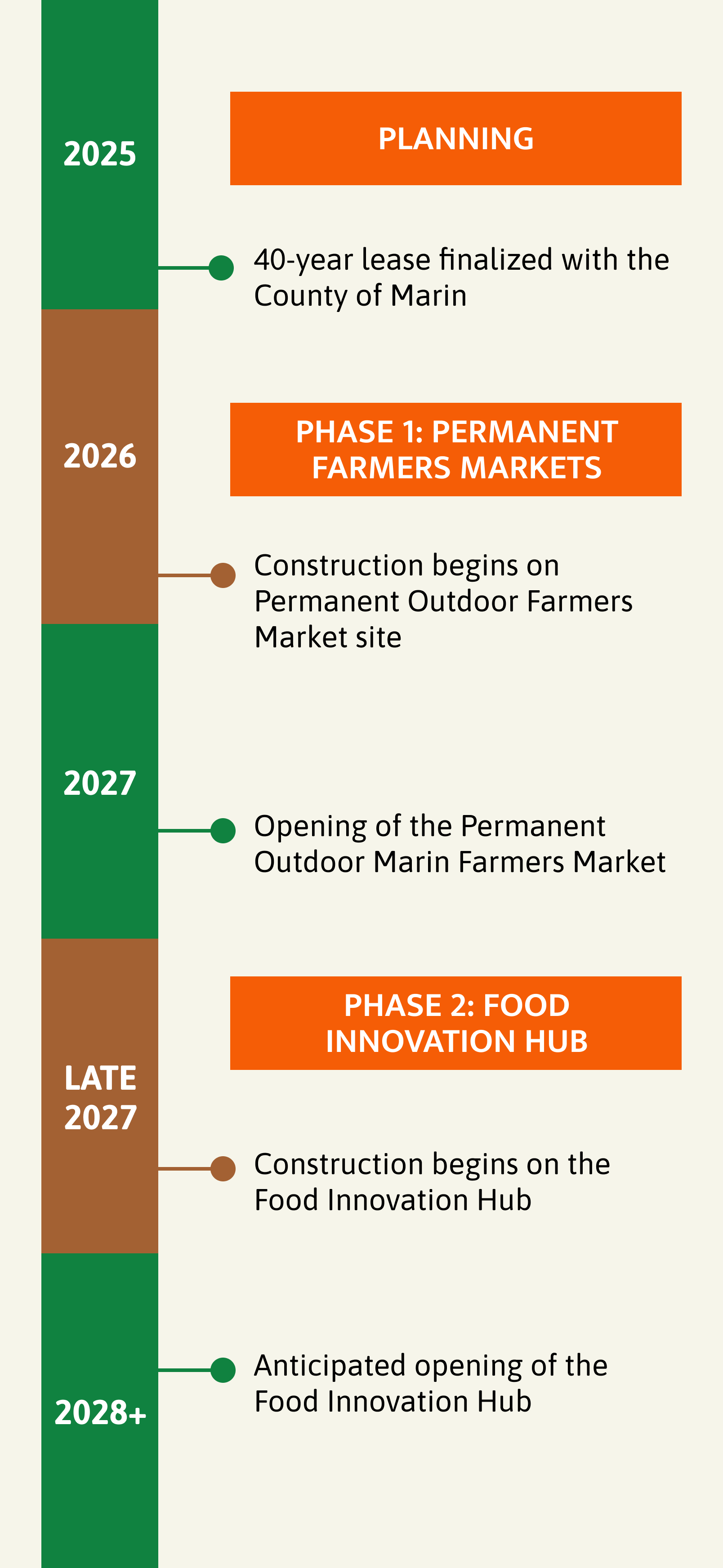 The Lease approved September 16, 2025; construction of Phase One, the permanent Farmers Market, begins in 2026 (opening in mid-2027); Food Innovation Hub is slated to open in 2028.