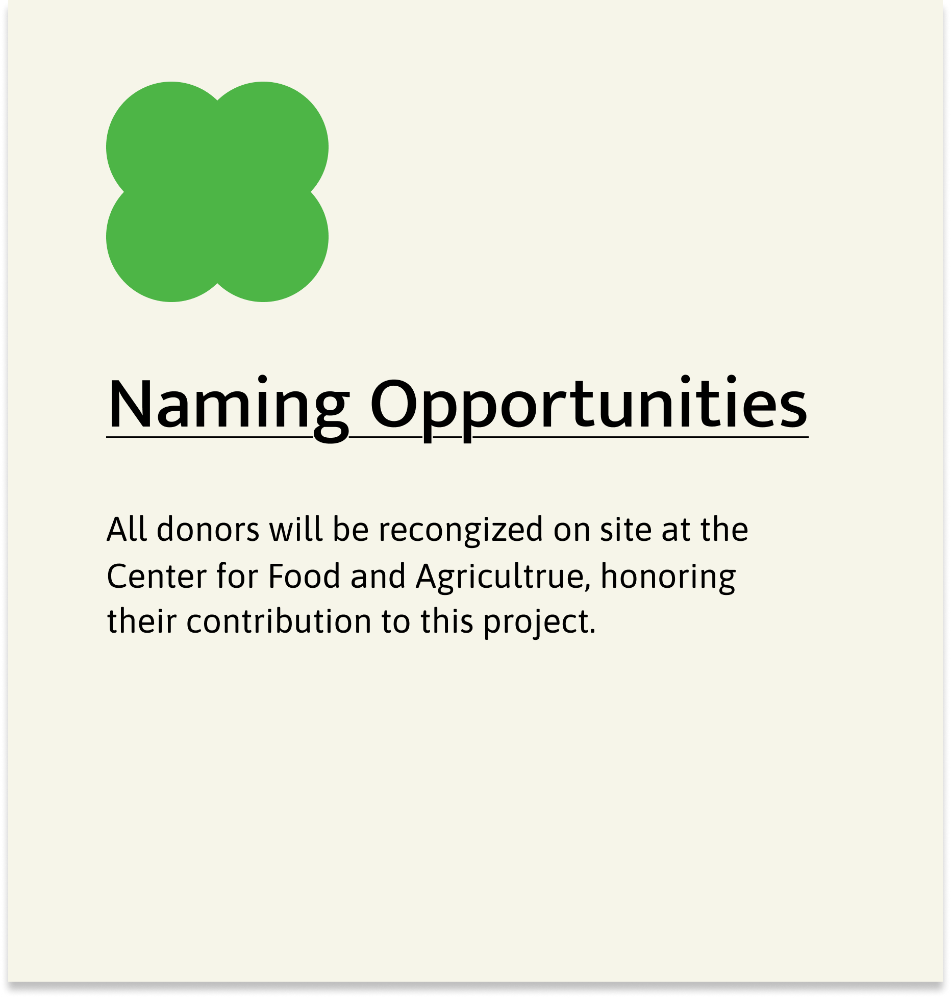 Let's build the Center for Food and Agriculture and make the creation of a healthier food system part of your legacy.