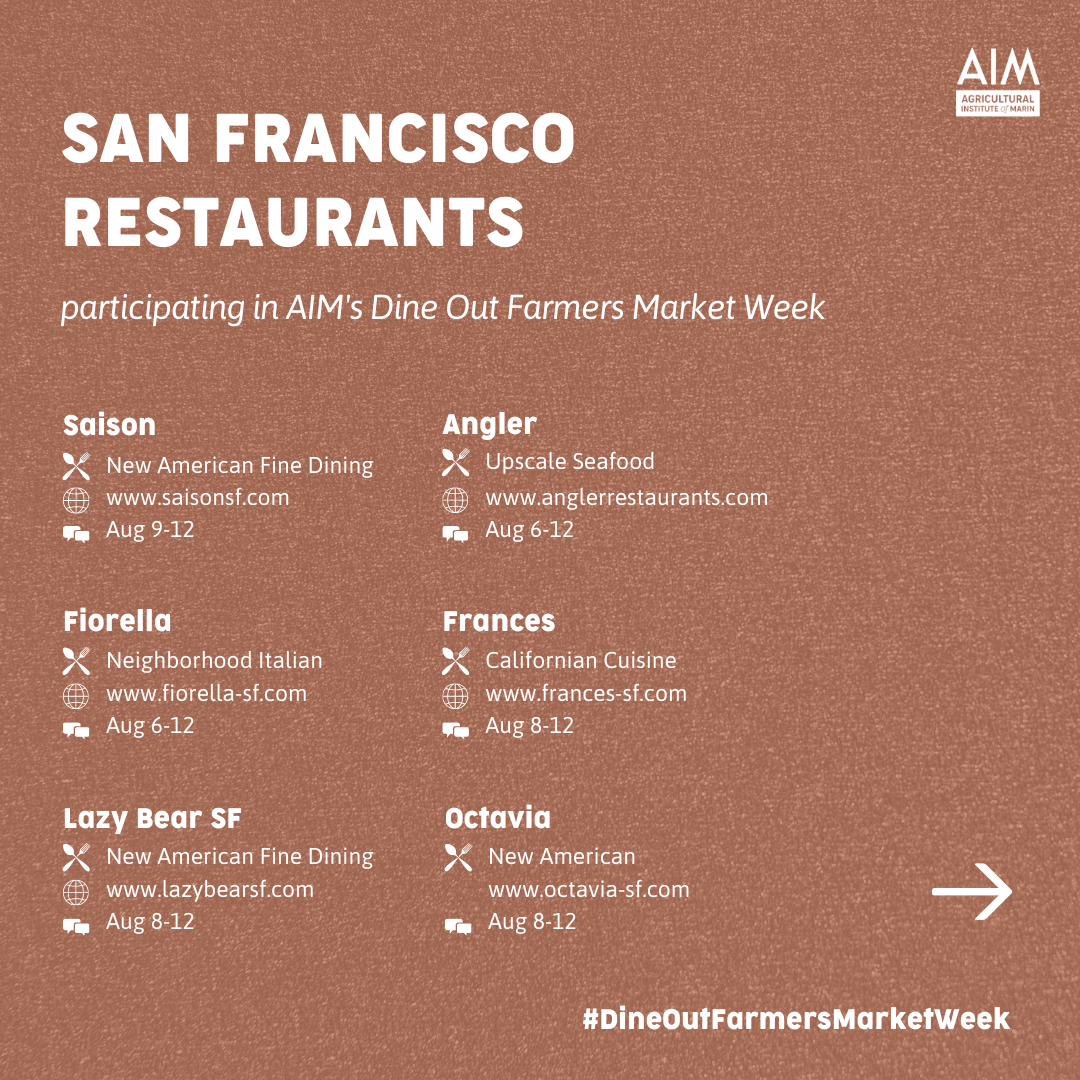 The week of August 6 – 12 is National Farmers Market week and the Agricultural Institute of Marin (AIM) is celebrating with a group of restaurants that source locally produced food and shop at the farmers market each week. During Dine Out Week, selected Bay Area restaurants will feature a farmers-market-inspired menu or a featured menu item highlighting local ingredients.