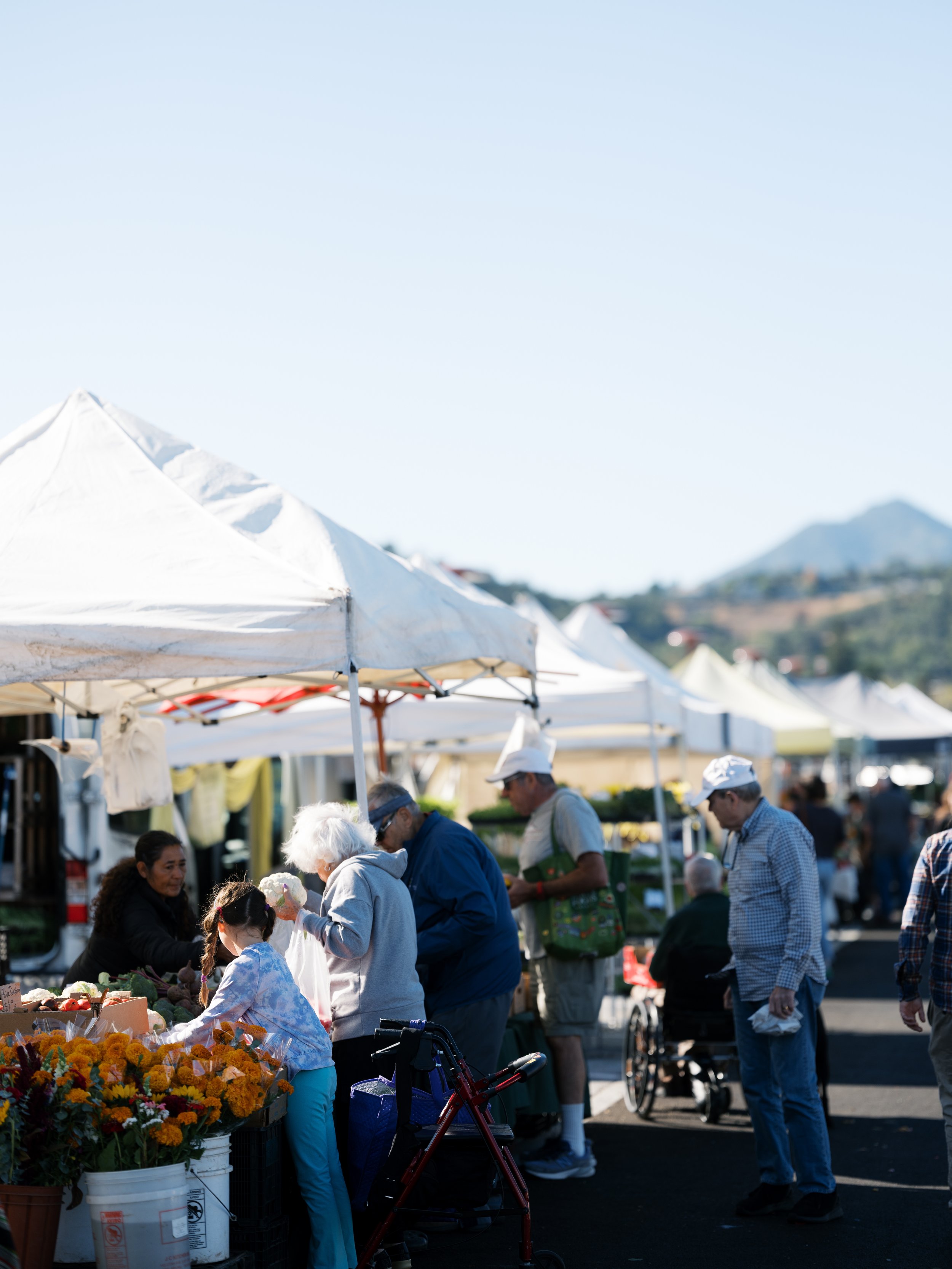 Situated next to the lagoon at the Marin Civic Center, the market is easily accessible by car (off the 101) or train (at the Marin Civic Center SMART station). There are ample biking and walking trails, plus plenty of space for picnicking—all with a scenic view of Mount Tamalpais.